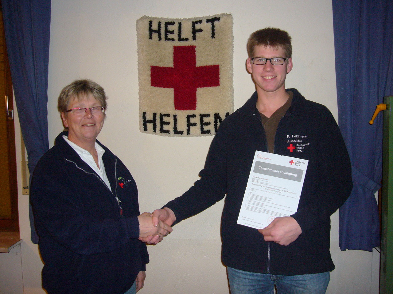 Die Vorsitzende D. Burkhardt gratuliert Fabian Feldmann zum EH-Ausbilder.