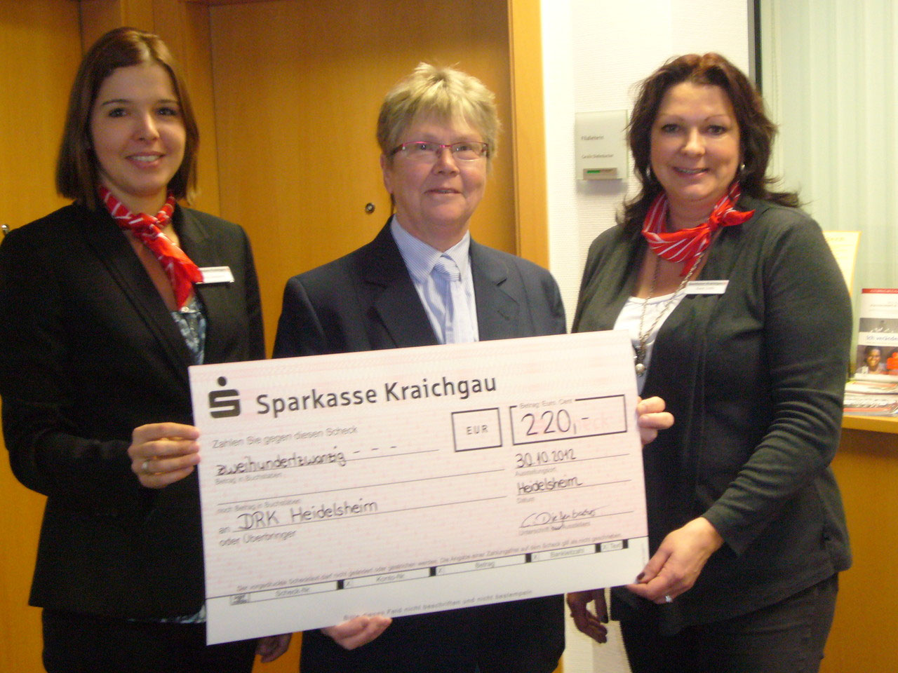 Am Weltspartag hat die Sparkasse Kraichgau in der Filiale Heidelsheim ein Spenden-Herz zugunsten der Notfallhilfe Heidelsheim aufgestellt. Sie legte denselben Betrag, der an diesem Tag gespendet wurde, noch dazu und überreichte uns einen Betrag von 220.-- €. Dafür möchten wir uns nochmals ganz herzlich bei den Spendern und bei der Sparkasse Kraichgau recht herzlich bedanken.